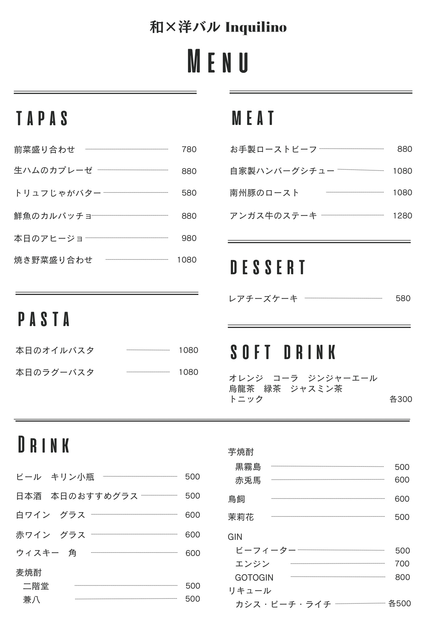ラスワイン赤or白500円、トリプル金賞ワイン700円、缶ビール各種500円、梅酒500円、ハイボール400円、ボウモア12年850円、ザクロハイボール500円、ジュース各300円、烏龍茶300円