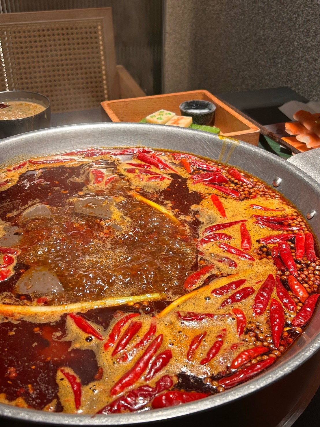 火鍋スープ:四川麻辣火鍋(ピリ辛、麻辣、激辛を選べる)もしくは辛くない薬膳スープ